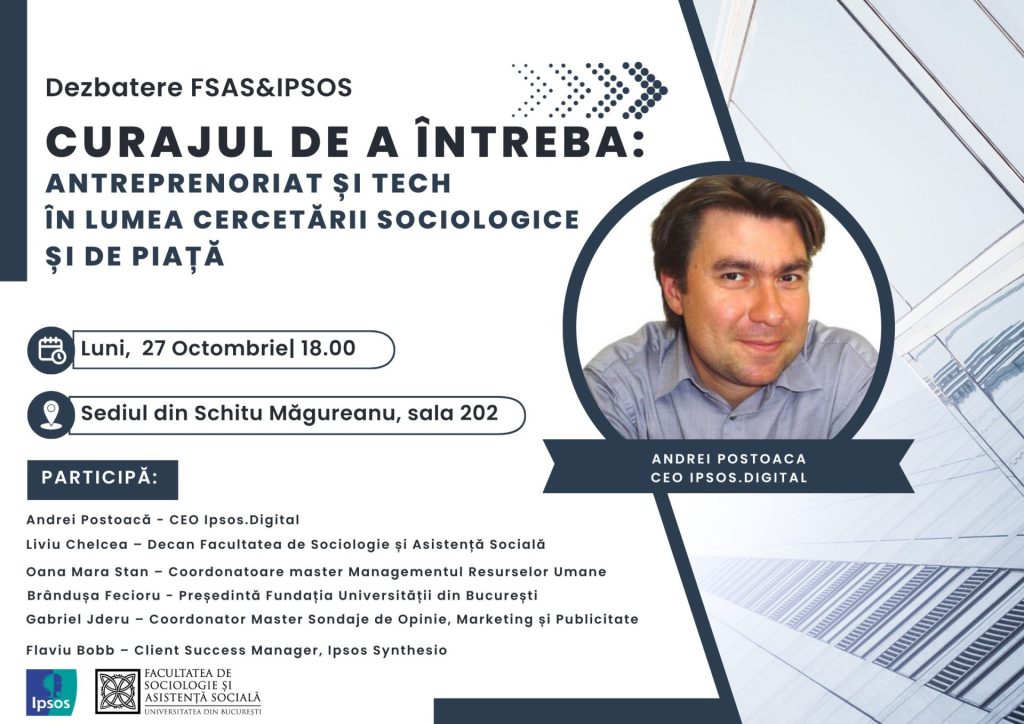 Vino alături de noi la o dezbatere specială despre 𝐜𝐮𝐦 𝐬𝐞 î𝐦𝐛𝐢𝐧ă 𝐚𝐧𝐭𝐫𝐞𝐩𝐫𝐞𝐧𝐨𝐫𝐢𝐚𝐭𝐮𝐥, 𝐭𝐞𝐡𝐧𝐨𝐥𝐨𝐠𝐢𝐚 ș𝐢 𝐜𝐞𝐫𝐜𝐞𝐭𝐚𝐫𝐞𝐚 𝐬𝐨𝐜𝐢𝐨𝐥𝐨𝐠𝐢𝐜ă ș𝐢 𝐝𝐞 𝐩𝐢𝐚ță organizată de 𝐃𝐞𝐩𝐚𝐫𝐭𝐚𝐦𝐞𝐧𝐭𝐮𝐥 𝐝𝐞 𝐒𝐨𝐜𝐢𝐨𝐥𝐨𝐠𝐢𝐞 𝐚𝐥 𝐅𝐒𝐀𝐒 și 𝐂𝐨𝐦𝐩𝐚𝐧𝐢𝐚 𝐈𝐏𝐒𝐎𝐒. Invitatul nostru, 𝐀𝐧𝐝𝐫𝐞𝐢 𝐏𝐨ș𝐭𝐨𝐚𝐜ă, este inovator tech, un om care a avut curajul să pună întrebări și să-și transforme ideile în realitate. Dacă ești curios/curioasă și vrei să afli cum arată cercetarea prin lentila unui vizionar tech, locul tău e aici.
